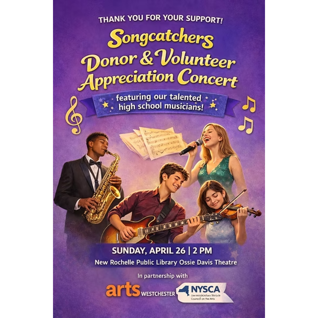Songcatchers Donor & Volunteer Appreciation Concert Sunday, April 26, 2026 2:00 PM 4:00 PM New Rochelle Public Library Ossie Davis Theatre 1 Library Plaza New Rochelle, NY, 10801 United States (map) Google Calendar ICS